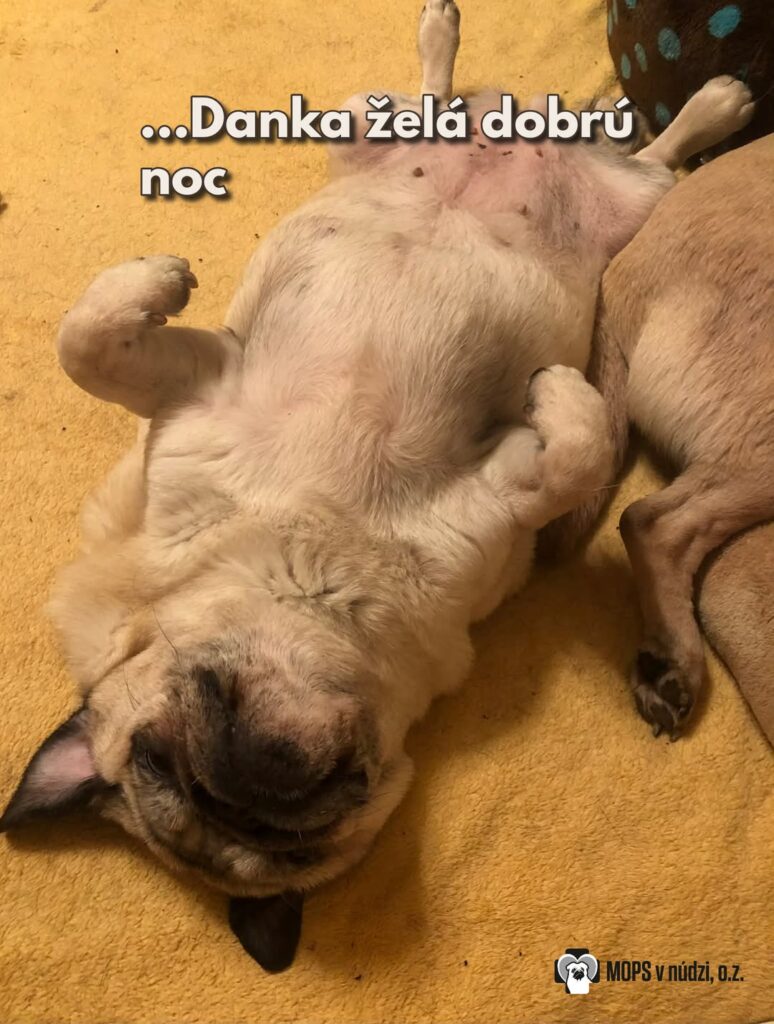 Danuška si hľadá milujúci domov prostredníctvom adopcie, kde by mohla prežiť pokojné a šťastné roky. Je drobná, nežná a veľmi krehká – skutočný poklad, ktorý čaká na svoju spriaznenú dušu. Mopsí parťák vítaný. Ostatné zvieratá a deti nemáme vyskúšané.
